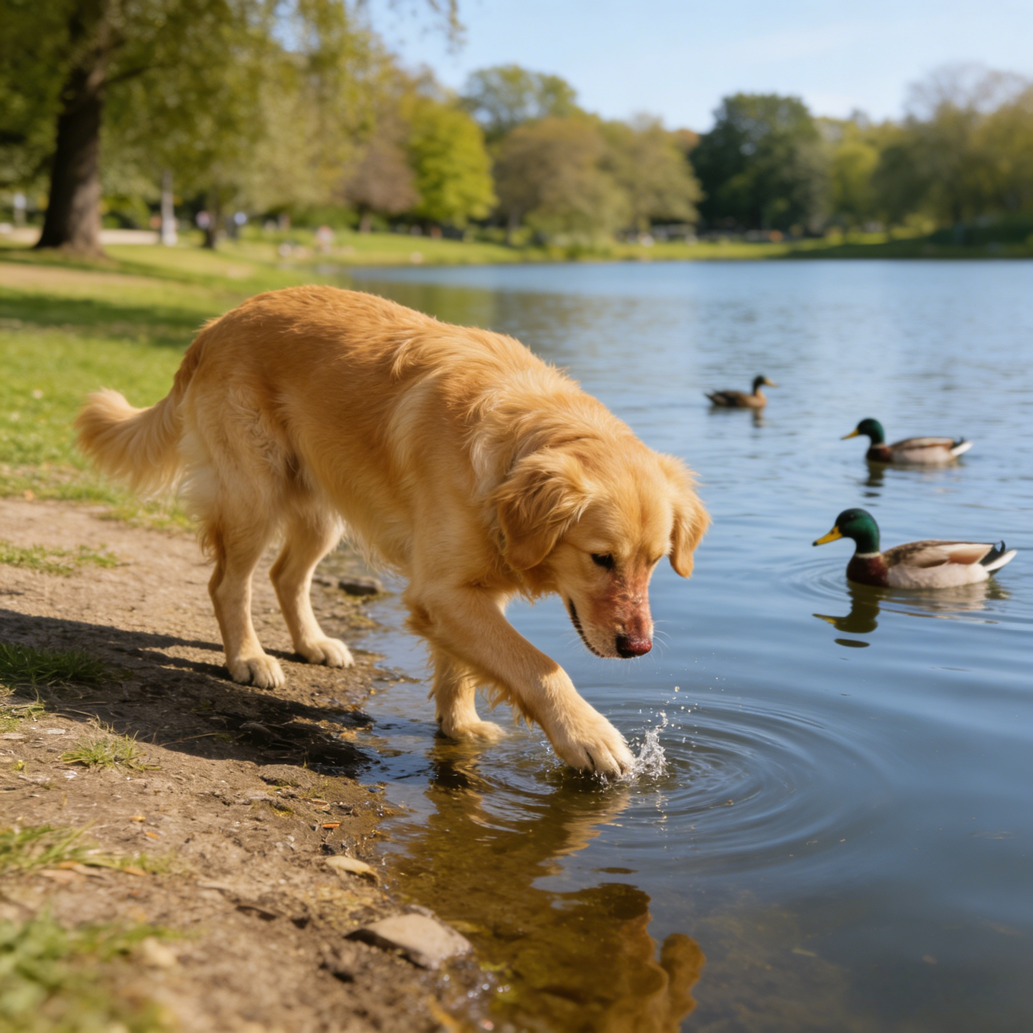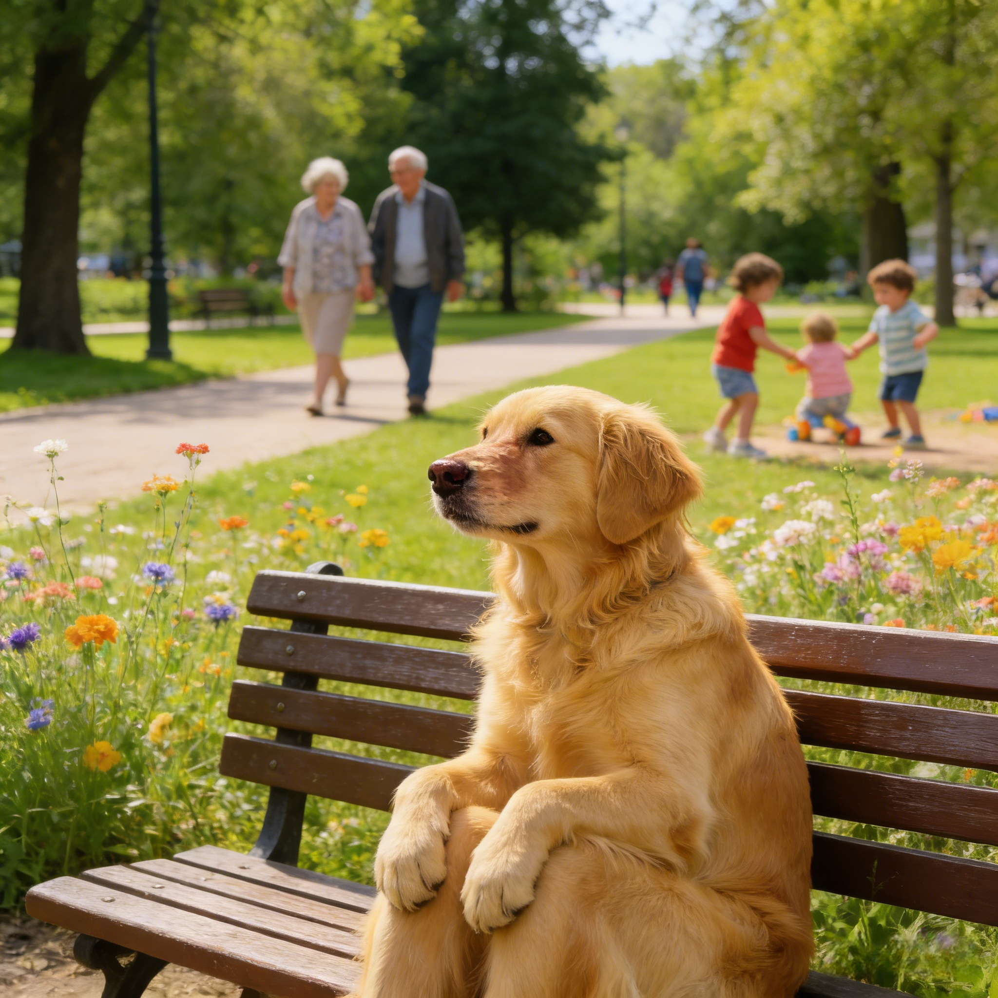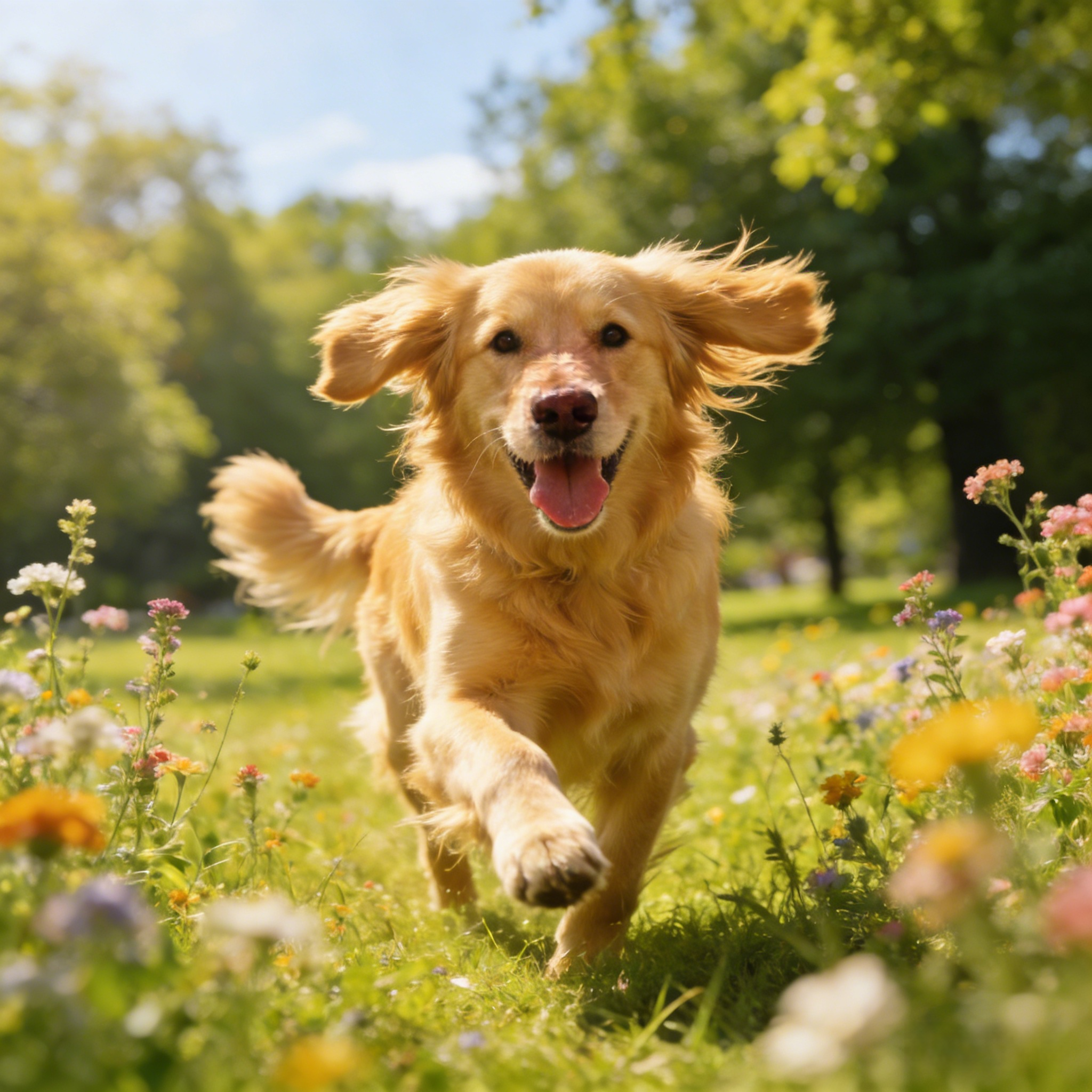 In the park, there is an elegant and lively Golden Retriever, revelling joyfully in its happy moments. Its gleaming golden coat shimmers brightly beneath the soft warm sunlight, as if streaks of scattered sunshine are draped all over its body. The dog has a pair of big, gentle eyes brimming with curiosity, exploring the world around it with boundless delight. It prances and frolics about cheerfully, chasing a bright, colourful ball now and then, and pausing to sniff the fragrant blossoms lining the path. Its fluffy plume of a tail wags exuberantly, revealing all the sheer joy and elation in its heart. Occasionally, it stops to play with the little creatures it encounters, or greets kind passers-by affectionately, showing its inherently gentle and friendly nature. Every little move and lovely gesture of this Golden Retriever adds a vibrant, lively and heartwarming vibe to the whole park.